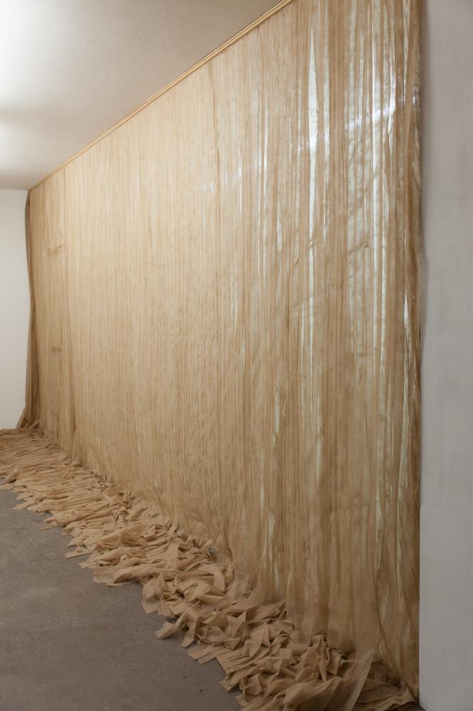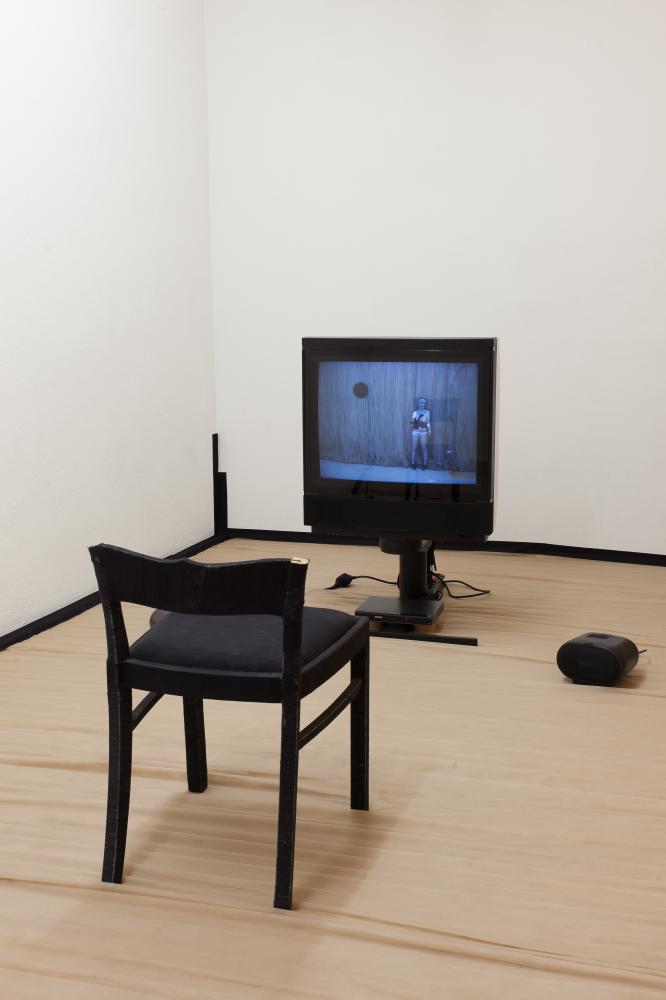 Franka Kaßner hat einen Raum entworfen, in dem sie »Mutter Beimlein« (Text: Bertolt Brecht, Musik: Hanns Eisler) singt. Das groteske Motiv – die Protagonistin ist trotz eines Holzbeins munter und selbstbewußt und unterhält die Familie als Prostituierte – setzt Franka Kaßner mit gebrochener Stimme und bandagiertem Körper in Szene. Sie konterkariert die körperliche Beeinträchtigung von »Mutter Beimlein« bzw. ihre eigene Verletzung mit der Haltung einer heroischen Frauenfigur. In ihrer Installation »Sie weint trocken« wird die Performance als Video (2 min.) gezeigt.