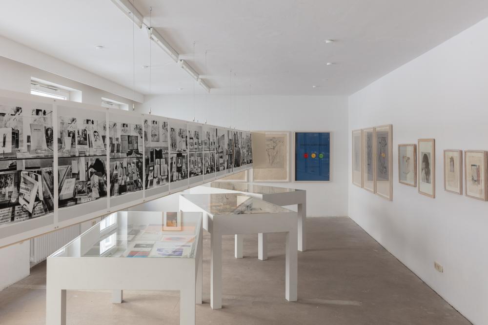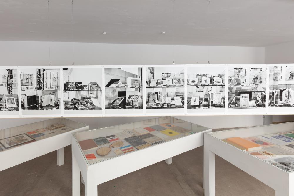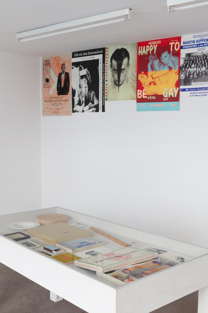 Daneben dokumentiert/rekonstruiert die Ausstellung eine Installation, die 1993 als zentrale Achse der Einzelausstellung »Candidature à une rétrospective« im Centre Georges Pompidou von Martin Kippenberger und Roberto Ohrt aufgebaut worden war. Sie wird möglich durch Fotografien, die Andrea Stappert im Mai 1993 aufgenommen hat. Sie lassen genau erkennen, was in der 16 Meter langen Vitrinenwand zu sehen war: alle Bücher, die Martin Kippenberger bis dahin publiziert hatte, sowie alle Vorlagen, Modelle oder Gegenbilder, die er dafür benutzte.