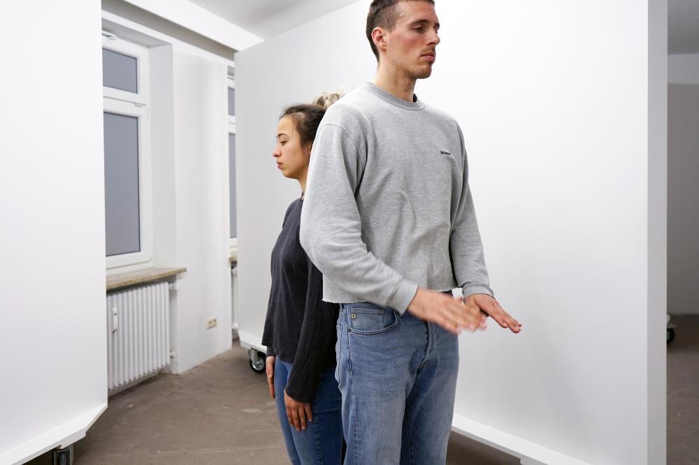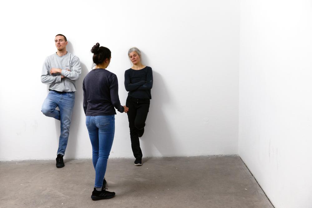 »Code and shadow; reverse TRIO« entsteht im Kunstraum als eine performative Raumstruktur. Sie wird von drei Tänzer*innen aktiviert und untersucht körperliche Handlung als sprachliche Struktur. Ausgehend von Alltagsbewegungen werden Zusammenhänge von Bewegung, Rhythmus und Sprache hergestellt und ihre Lesart untersucht. Kommunikationsbewegungen bilden das Bewegungsrepertoire der Tänzer*innen, wobei die Bewegungen durch ihren ursprünglich alltäglichen Gebrauch einen für die Betrachter*innen lesbaren Code in sich tragen und so körperliche Zugänglichkeit ermöglichen. Innerhalb der Performance transformieren sich die Bewegungen, verlieren ihren Kontext und erreichen neue Formen, indem sie zu einem körperlichen Abdruck oder Schatten der Ursprungsbewegung entwickelt werden. Es entsteht so ein eigenständig neuer Code, der seinen eigenen Kontext produziert. Die einzelnen »Körper im Raum«, Besucher*innen, Tänzer*innen, Raumstruktur und Notation treten als eigenständige Zustände zurück, während ihr Zusammenhang und ihr mimetisches Potential vorrangig wird. Somit nehmen die Körper eine Art Platzhalterfunktion ein, um Raum und Bewegung als Potential und situatives Moment zu verstehen. Handlung wird als verbindendes Element zwischen Raum und Körper eingeführt.