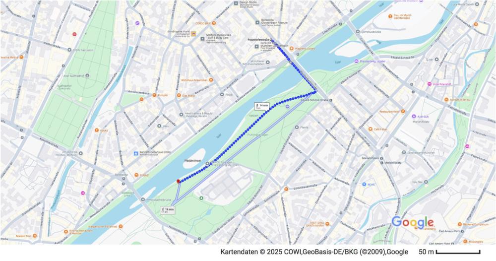 4. Am Ufer entlang der Isar bis an die markierte Location gehen